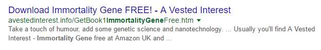 If I type in the series also - A Vested Interest Immortality Gene' I find myself as number 1, 2, 3, 4, 5, 6, 7, 8, 9 and 10 of the first page of search results. OK that's pretty good but who is going to enter the book series also in a search? I needed to do some SEO - Search Engine Optimisation to bring my 'Immortality Gene' references to the first page of search results.